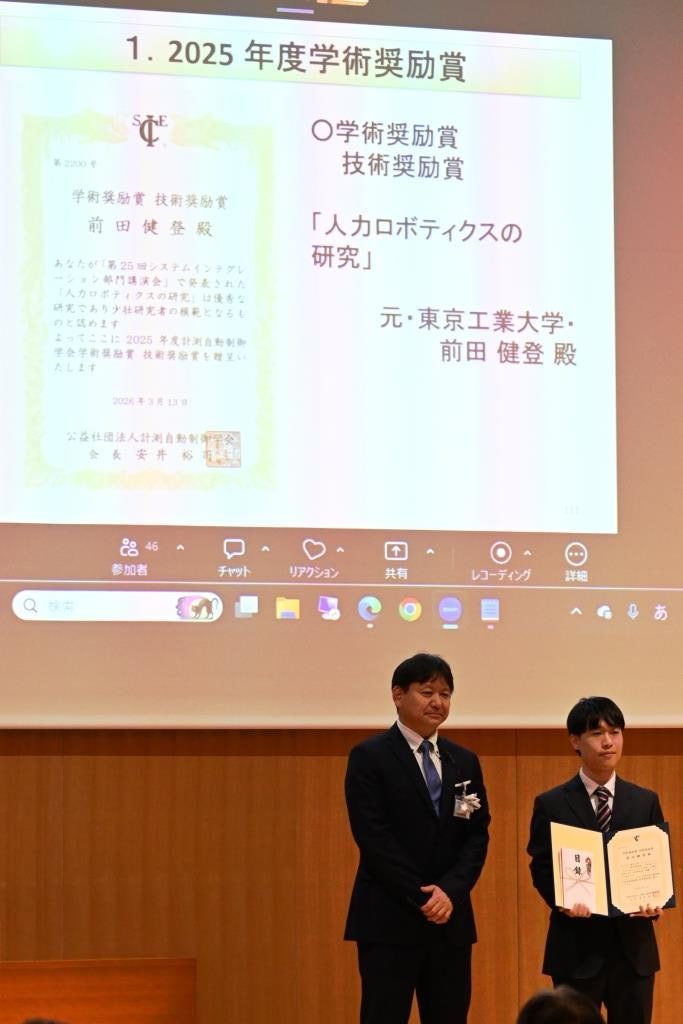 OBの前田健登君が,第25回システムインテグレーション部門講演会(SI2024)で発表した「人力ロボティクスの研究」で,計測自動制御学会より学術奨励賞 技術奨励賞を受賞しました.
